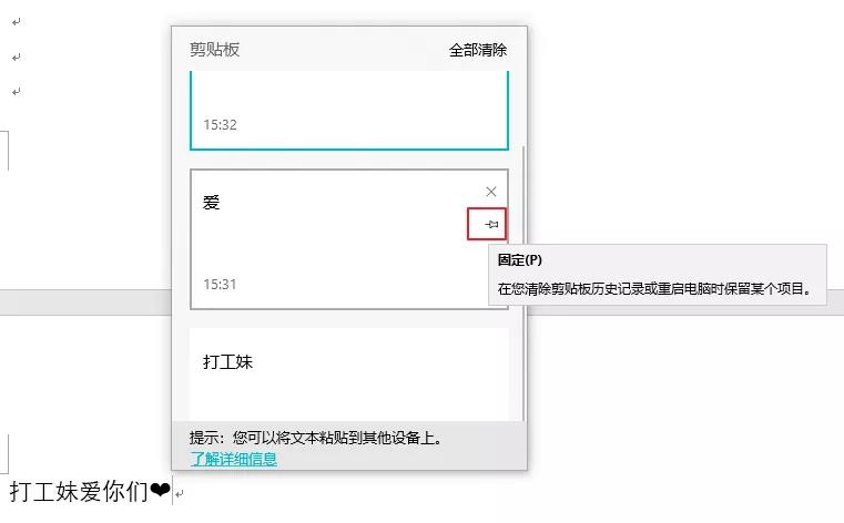 右上角的这个“钉子”标志,代表着你可以在剪贴板里固定这一内容。