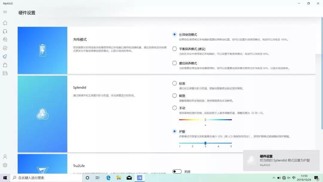 现在它的设置集成在MY ASUS这款软件当中,找到MY ASUS,打开“硬件设置”,选择护眼模式即可。