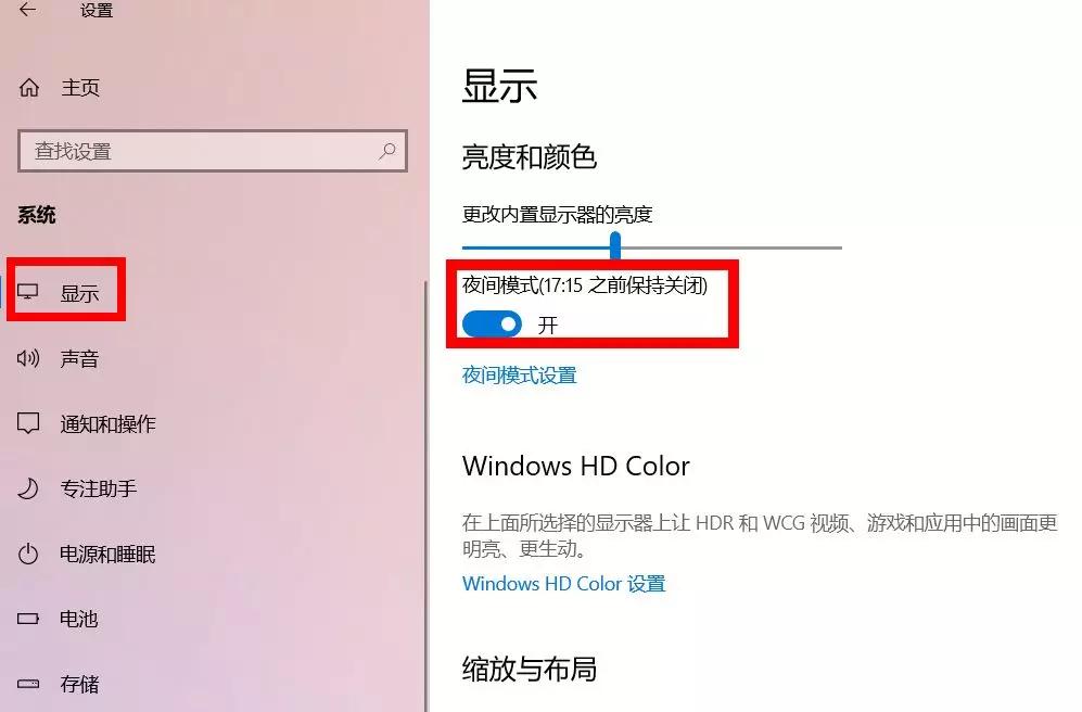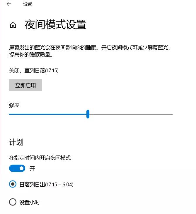 ps:从WIN10 1703版本开始加入夜间模式,找不到则您的系统需要更新了哦~