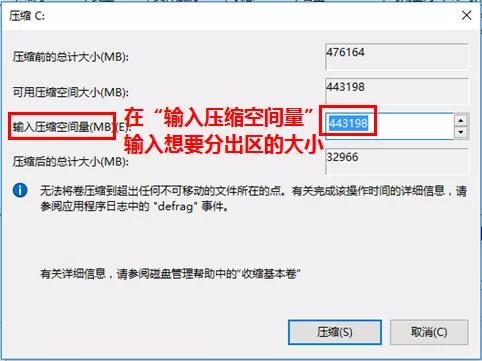 注意:Windows系统按1024MB=1GB计算,硬盘厂商则按1000MB=1GB换算,以得到100GB新分区为例,压缩空间量应输入102400而不是100000