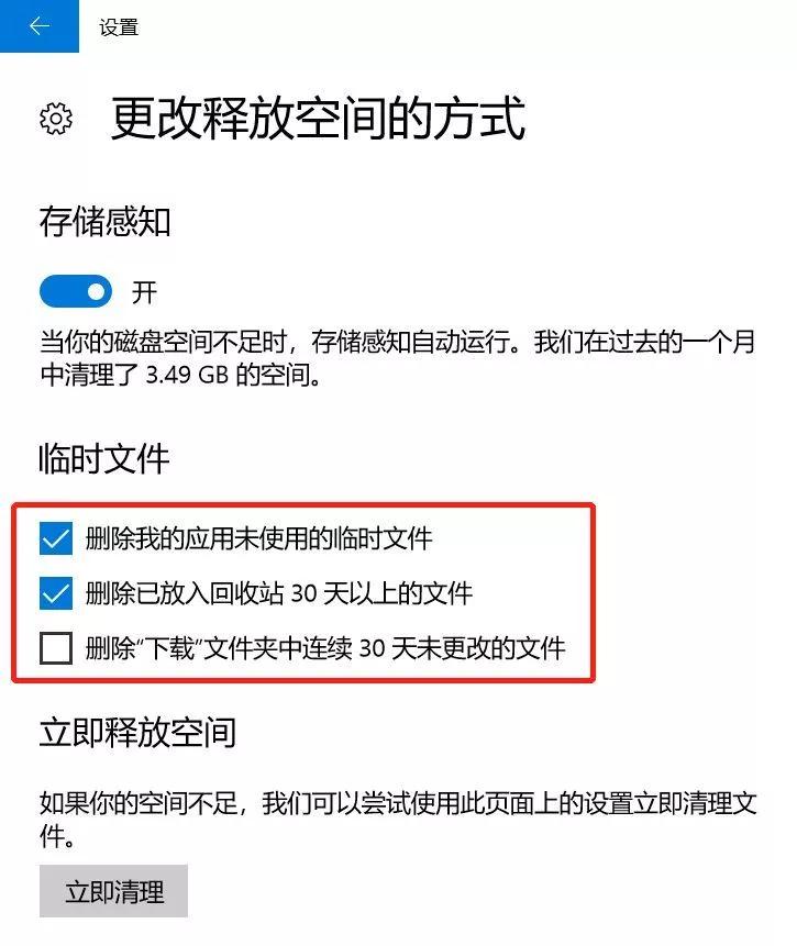 Win10 1703以上版本支持的存储感知功能,能让系统通过删除不需要的文件(如临时或回收站内的文件等)来自动释放空间。