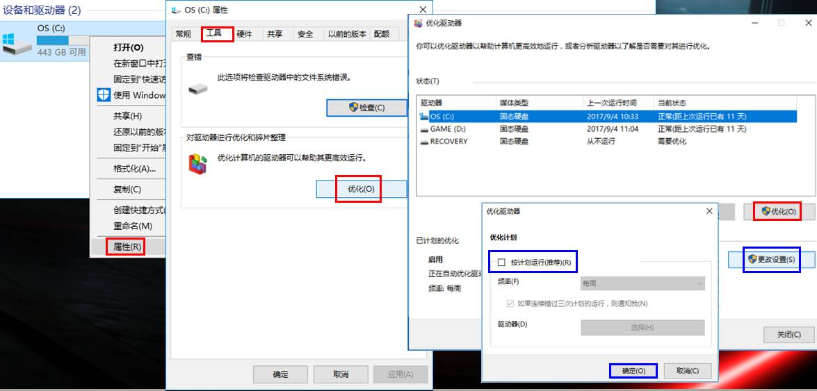 2. 手动整理磁盘碎片,并关闭整理计划。选中磁盘右击【属性】【优化】点击磁盘并优化。优化完毕后点击【更改设置】,取消【按计划运行】。
