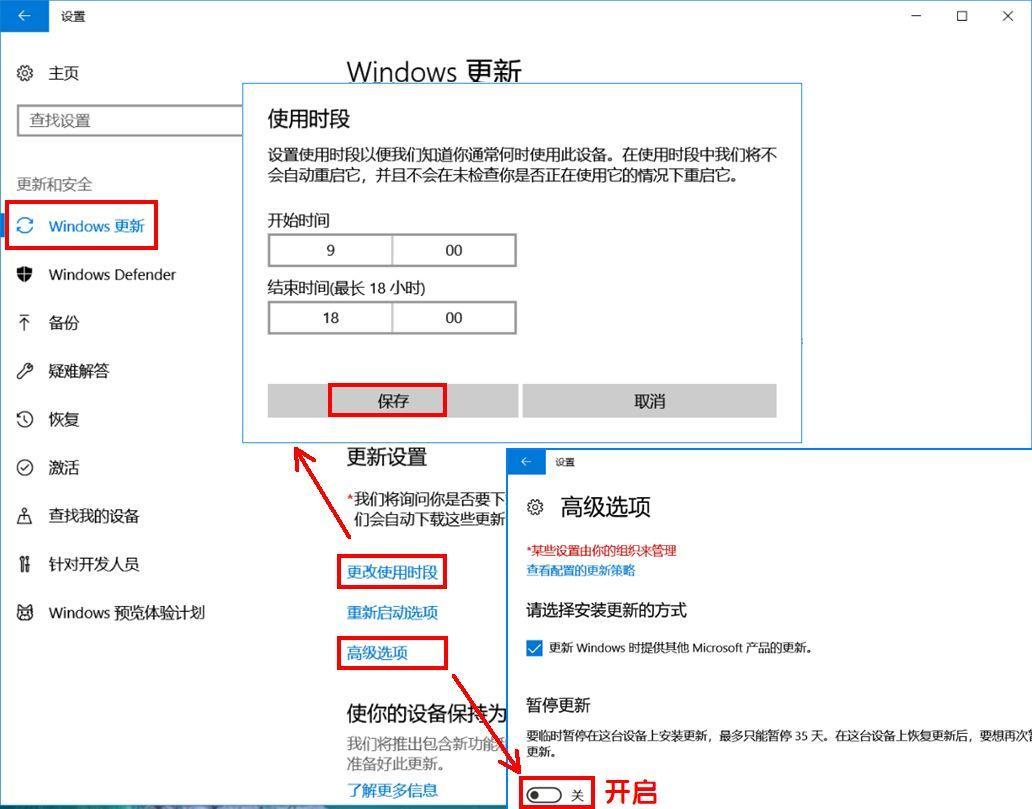 依次点击【开始】【设置】【更新和安全】【Windows更新】【更改使用时段】,设置想要避开系统更新的时间段,点击【保存】。