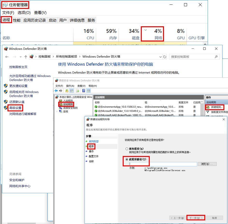 对当前无需占用网络资源的程序进行设置:【WIN+Q】搜索并进入【控制面板】,【大图标】查看方式选择【Windows Defender防火墙】【高级设置】,在弹出的界面点击【出站规则】【新建规则】,按照【程序-此程序路径-阻止连接-全选何时应用该规则】顺序,根据提示完成并命名即可。