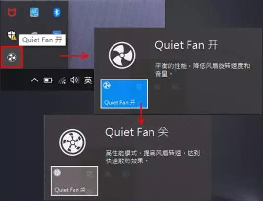 通过桌面右下角图标(或通过【WIN】+【R】搜索【Quiet Fan】进入)并切换Quiet Fan模式:
