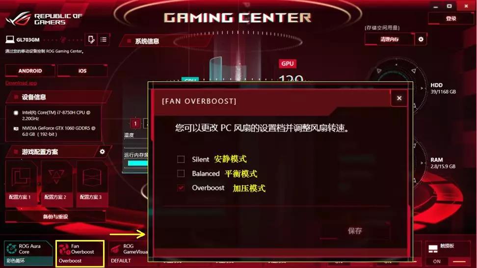 部分游戏本支持在Gaming Center中手动调节风扇转速的模式。