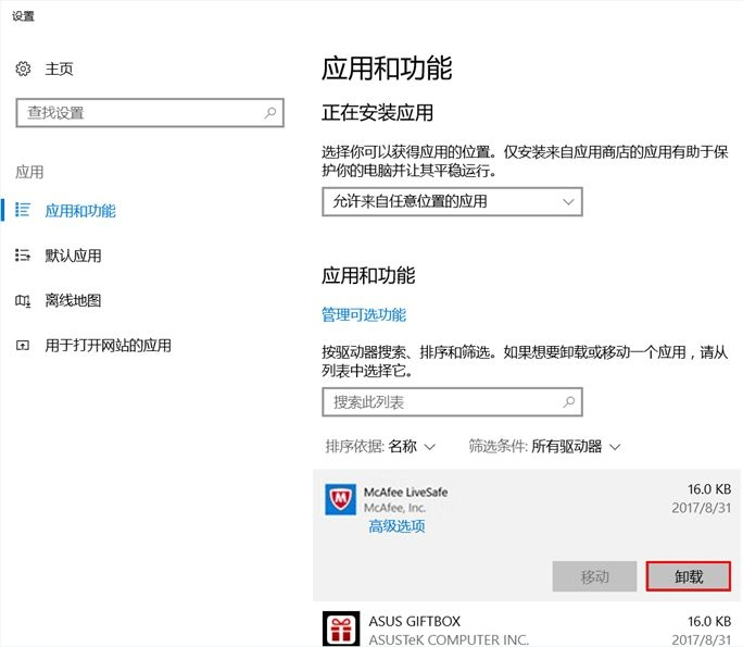 在程序与功能内,选择McAfee LiveSafe,并点击卸载。