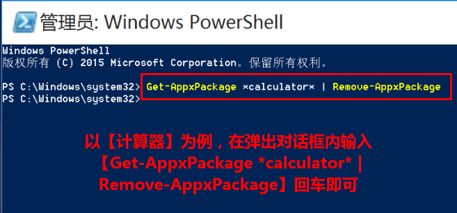 以【计算器】为例,在弹出对话框内输入【Get-AppxPackage *calculator* | Remove-AppxPackage】(可以直接复制粘贴)回车。