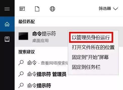①搜索框搜索并打开命令提示符(以管理员身份运行)。