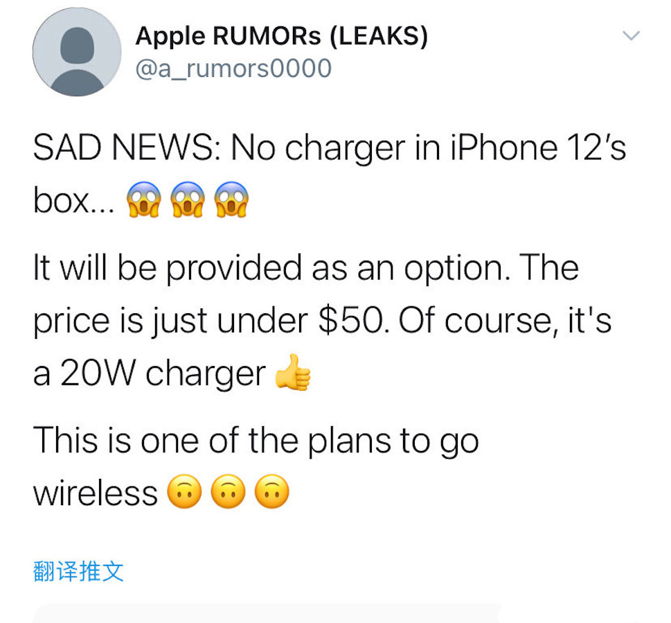 不过话虽如此,据外媒报道,库克对于iPhone12做出了一项“骚”操作,为了推行无线充电技术,苹果决定iPhone12将不再标配充电器。换句话说,如果你想要购买iPhone12就必须要额外购买充电器。苹果今年推出了一款20W快充充电器,不过遗憾的是这一款充电器并不会随机附赠,而是需要用户额外花费50美金购买,换句话说就是需要自掏300多元腰包购买充电器,这真是一个悲伤的故事。