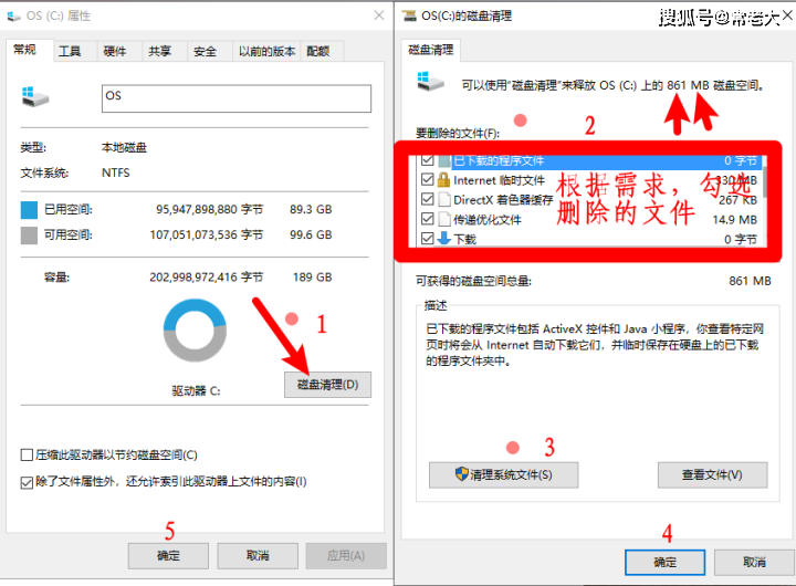 2.选择【磁盘清理】,之后可以看到可以清理861MB的空间大小,由于我更改了桌面路径,所以在这里看着861MB很小,几乎不影响电脑。然后根据需求选择要删除的文件,最后选择【清理系统文件】,清理完毕后,点击【确认即可】。