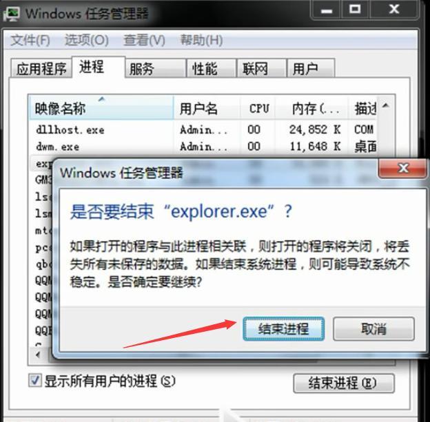 4、在下拉菜单中单击结束进程。在弹出的确认窗口中再次点击结束进程。