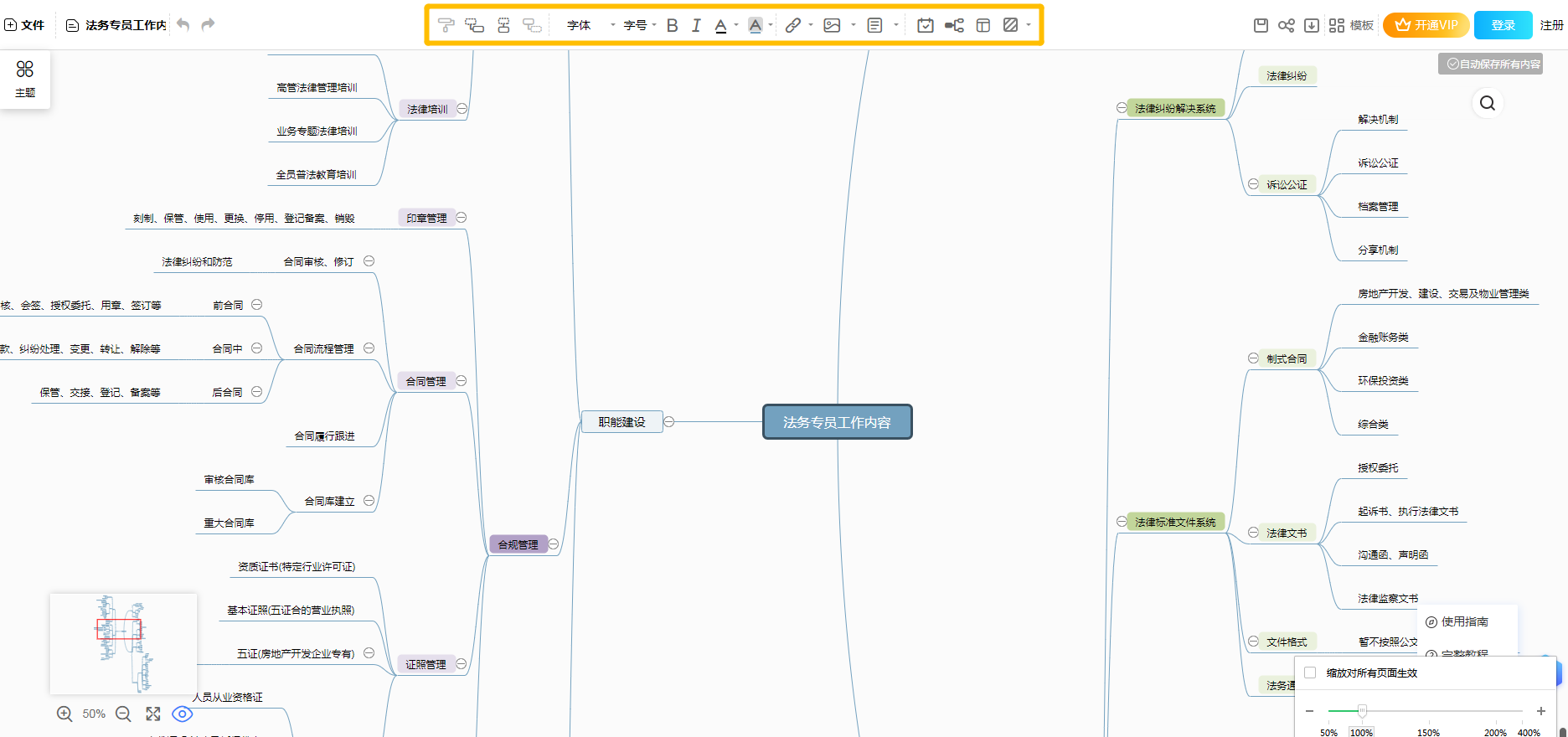 套用模板后,进入思维导图的绘制页面。在页面中间有脑图内容,大家可对它进行全面浏览。页面上方有移动、缩小以及放大等工具图标,点击即可使用。此外,该网站还支持修改、编辑模板字体内容等呢。