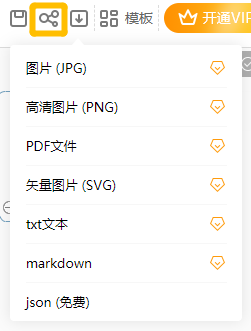 完成脑图绘制后,小伙伴们可以对它进行保存、分享操作哦。点击页面右上角的【分享】图标,即可以jpg图片、png高清图片、pdf文件、svg矢量图片、txt文本、markdown以及免费json等方式一键分享脑图出去。