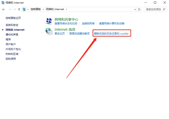 在网络和Internet设置页中,选择Internet选项下的“删除浏览多历史记录和cookie”,点击进入。