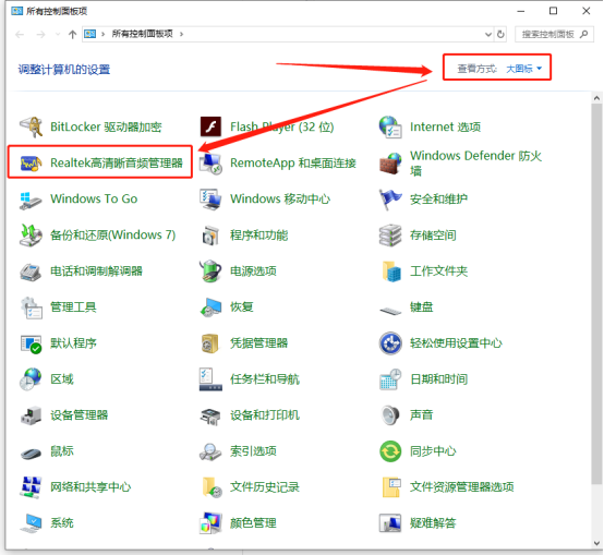 在弹出的“控制面板”页面中,将查看方式设置为“大图标”。然后找到并进入“Realtek高清晰音频管理器”。