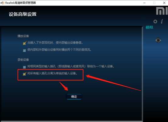 在高级设置页面中,勾选上“将所有输入插孔拆分离为单独的输入设备”前的单选框。然后依次在弹出的窗口中点击“确定”即可。