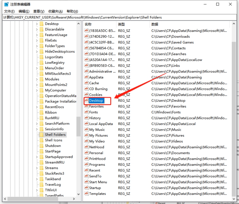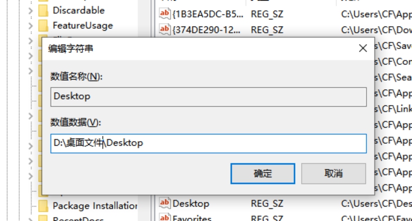 在右面双击打开“Desktop”,将数值数据修改为“D:\桌面文件\Desktop”。