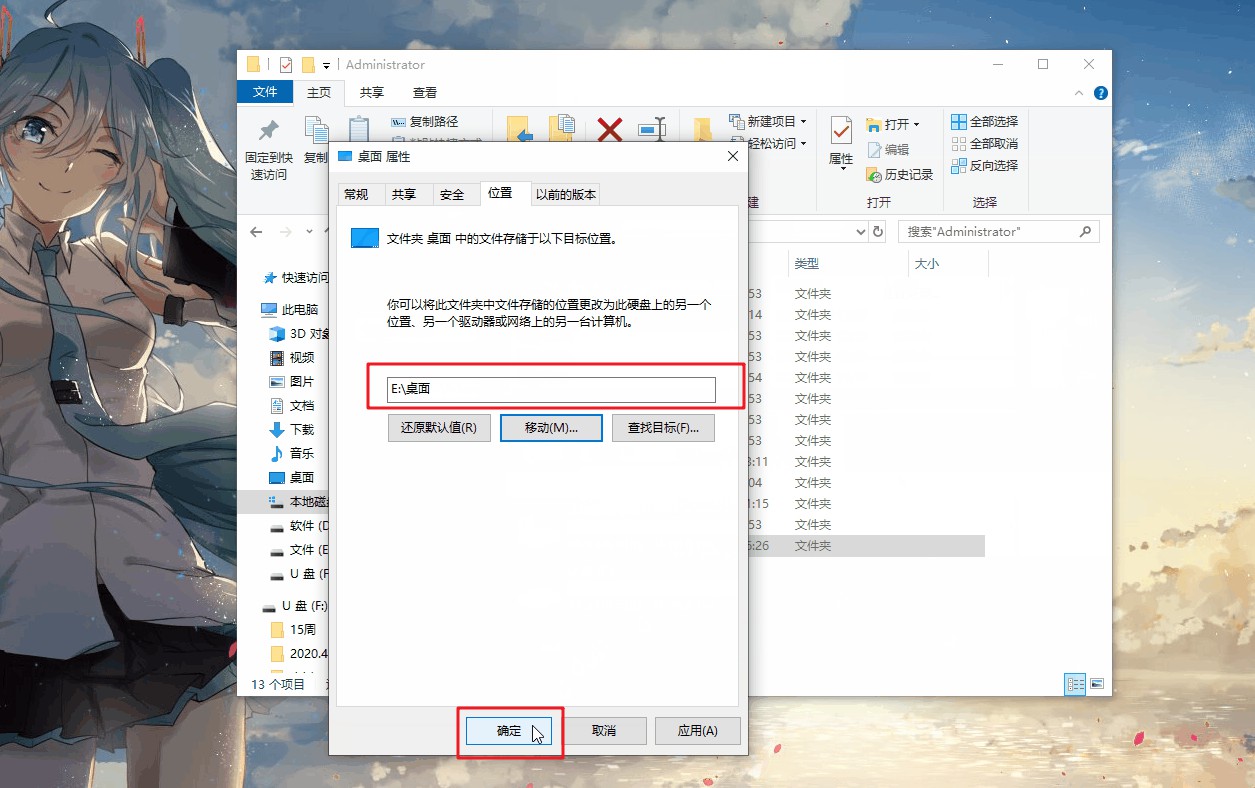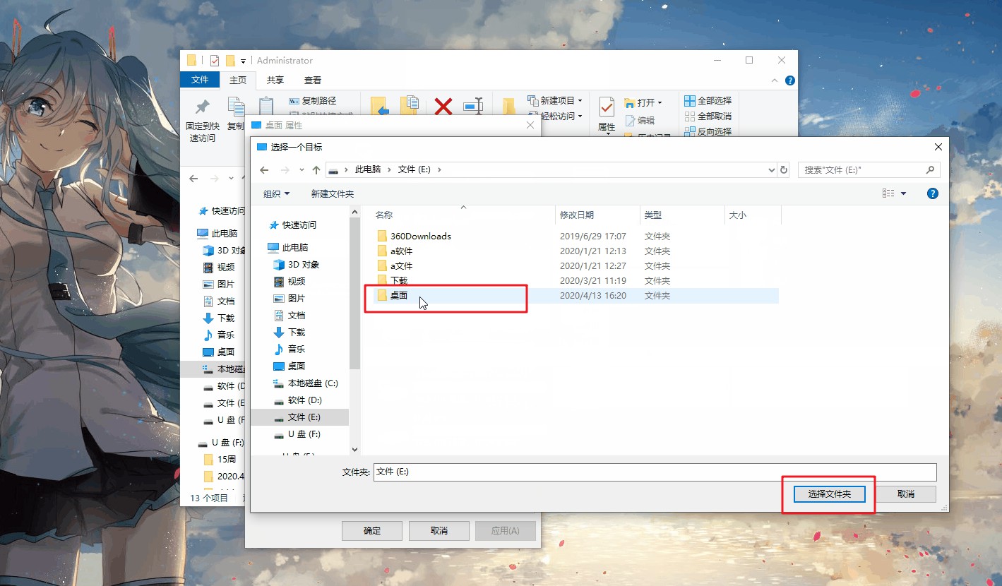 4、 选择移动的位置,比如刚刚在E盘新建的桌面文件夹,点击“选择文件夹”