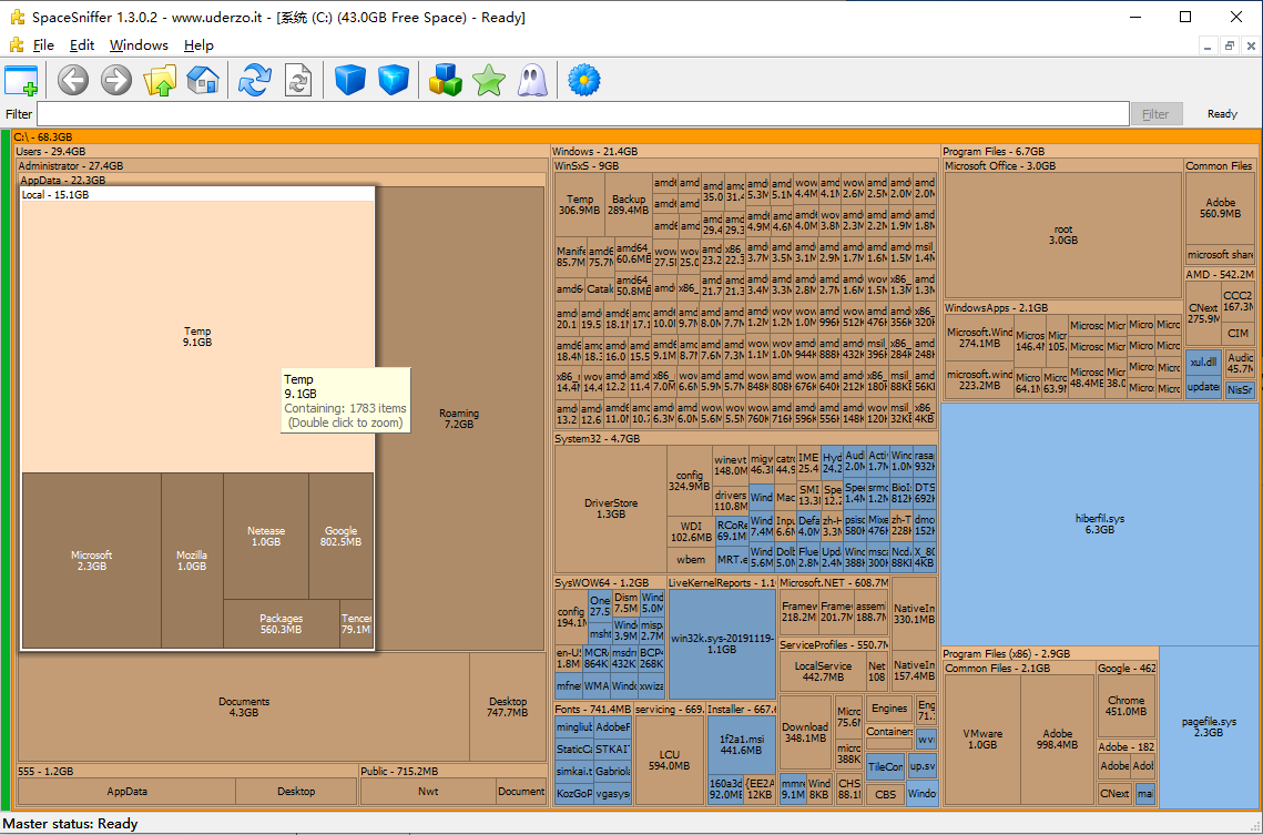 面对这个问题,大白菜果断打开SpaceSniffer,选择C盘进行磁盘空间分析。