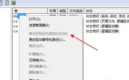 5.如果找到没有驱动器号的存储磁盘,则将其单击,然后单击以将该分区标记为活动分区并命名为活动分区。