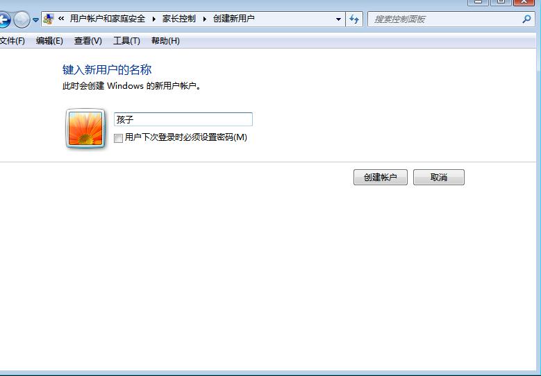 3,然后在键入新用户的名称中输入“孩子”,然后点击“创建账户”按钮,这个时候你的计算机应该有两个账户,一个是作为家长的管理员账号,另一个叫做孩子的账户则是给孩子使用。