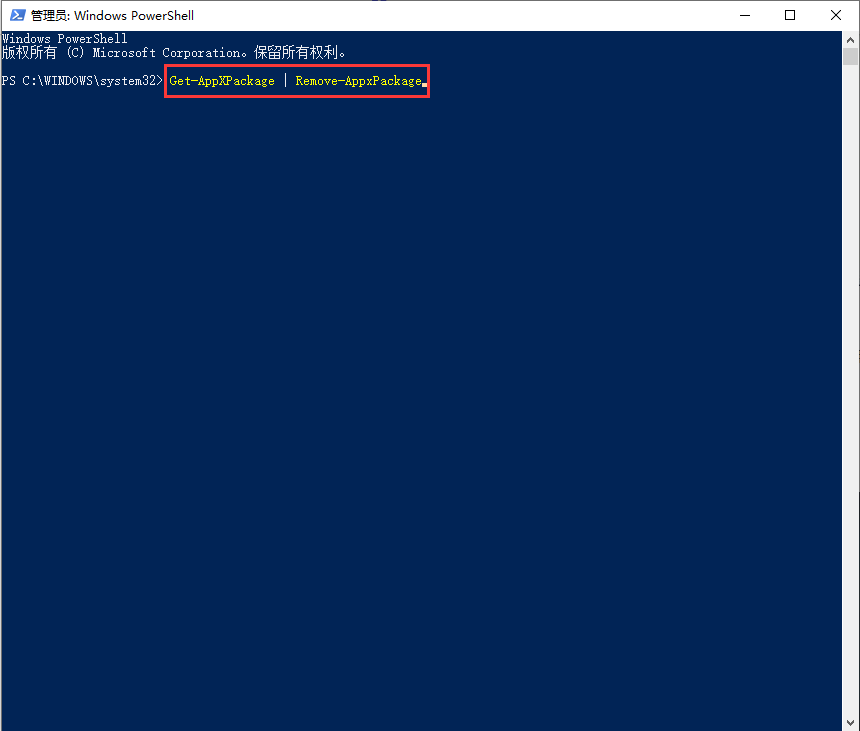 2,输入“Get-AppXPackage | Remove-AppxPackage”按下回车键开始执行删除,过程可能会持续一段时间并且会报错,不过不用担心,不会影响删除的。