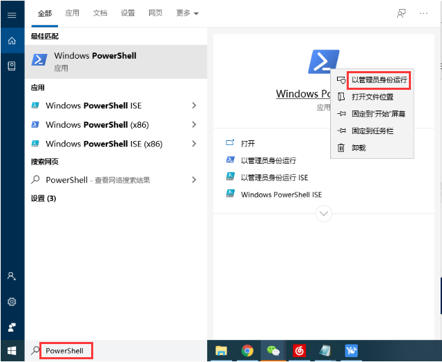 1,首先,点击任务栏左下角的搜索框输入“PowerShell”,接着右键点击PowerShell功能选择“以管理员身份运行”下一步。