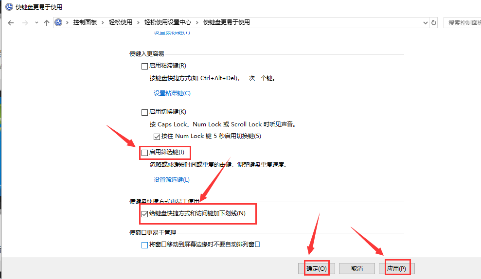 5,将“启用筛选键”前面的勾勾去掉,接着勾选上“给键盘快捷方式和访问键加下划线”,然后点击“应用”和“确定”按钮即可。