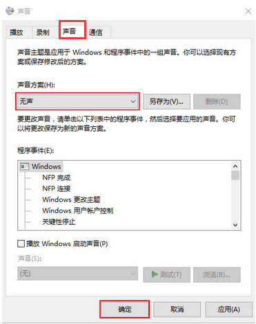 3,将弹出的小窗口切换到“声音”选项,并将声音方案更改为“无声”,点击“确定”即可。