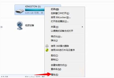 1,先将u盘插入电脑,右键点击u盘在弹出的菜单栏选中“属性”选项。
