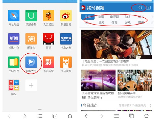 2、我们以UC自带的应用为例,找到“视频大全”的图标并打开,里面有丰富的视频资源可以观看,也可以在搜索栏里进行自定义搜索。