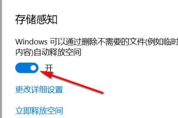 3、在储存界面的右侧,打开存储感知下面的滑动开关,系统就会自动删除不需要的文件。