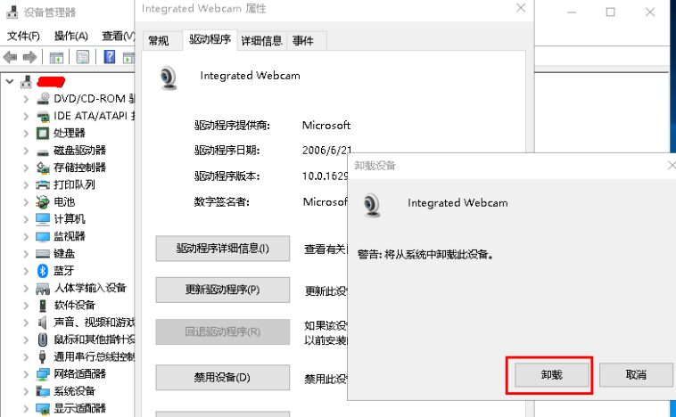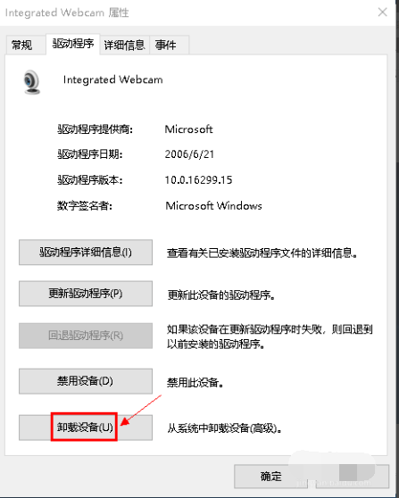 4,点击“驱动程序”选项卡,然后选择“卸载设备”下一步。
