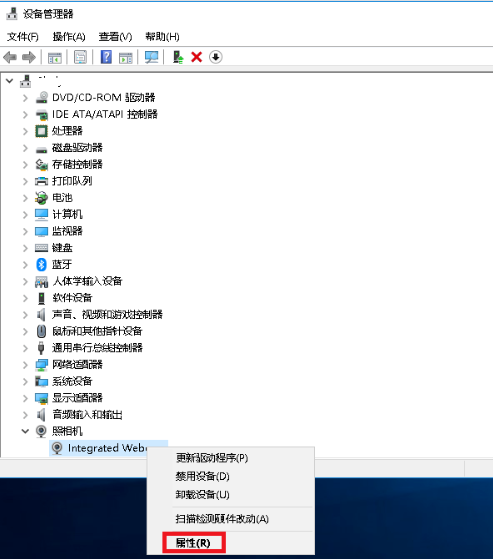 3,进入设备管理器界面后,找到并展开“照相机”选项,并右键点击摄像头选项,点击“属性”进入。