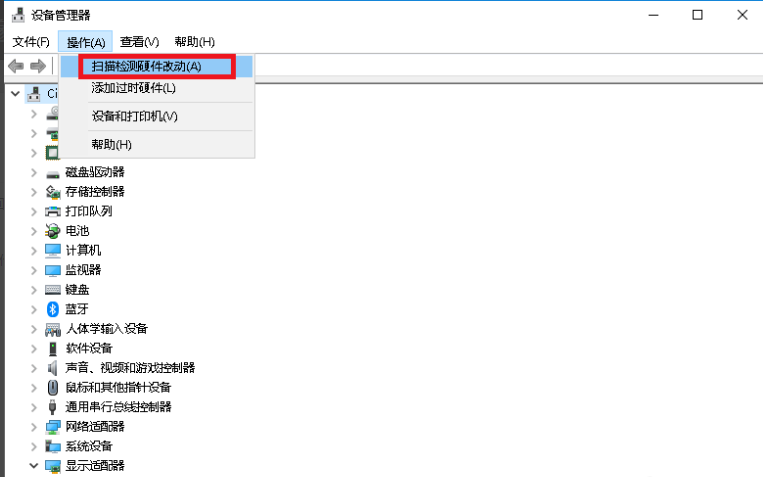 6,卸载完成后,点击上方菜单的“操作”,选择“扫描硬件改动”下一步。