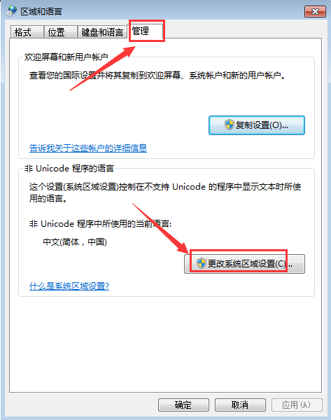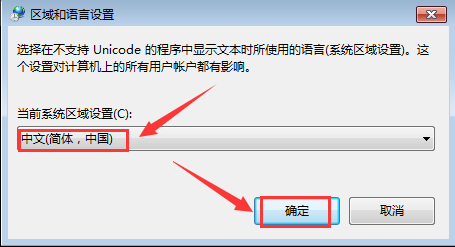 5,然后将当前系统区域设置更改为“中文(简体,中国)”,点击确定重启电脑即可。