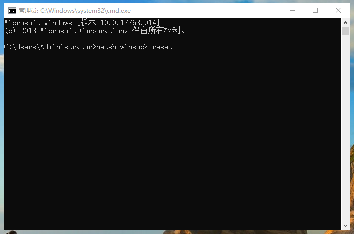 2、在打开的命令提示符中输入“netsh winsock reset”,回车。