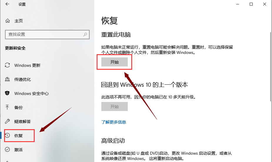 2,出现如图下窗口,点击界面左侧“恢复”选项,接着界面右侧点击“开始”按钮。