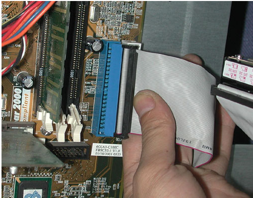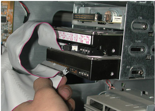 打开机箱,将硬盘安装到机箱的3.5英寸安装支架中,并用螺钉固定。将第一条ide数据线的一端插入旧硬盘的ide接口,将ide数据线的中间端插入新硬盘的ide接口,如图4所示。此外,IDE数据线的Pin1(红边)必须与硬盘和IDE接口的Pin1相连。最后,将梯形四针电源插头连接到硬盘的电源插座上。