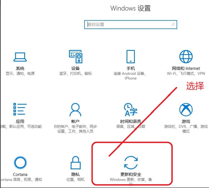 1。点击打开“开始”菜单,点击“设置”按钮,进入windows设置界面,找到“更新与安全”,点击进入,如下图;