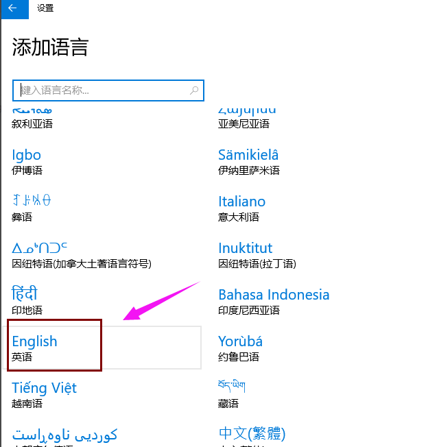 4。在“添加语言”界面中,选择“英语”进入下一步。