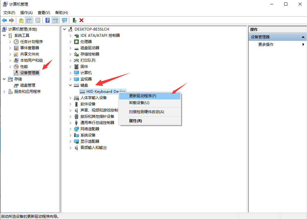 3.单击左列中的设备管理器,然后单击右侧的键盘,右键单击连接到计算机的键盘,然后选择更新驱动程序,通常在更新键盘驱动程序后,即可正常使用。