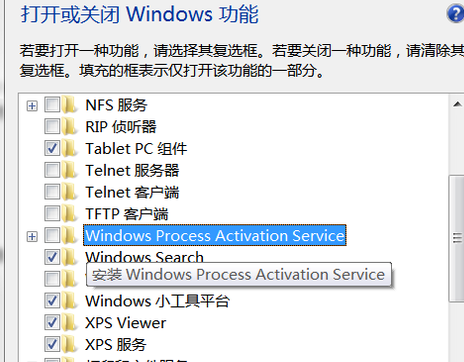 7、打开后,找到Windows Process Activation Service”这个选项。然后将复选框勾上,单击”确定“按钮即可。