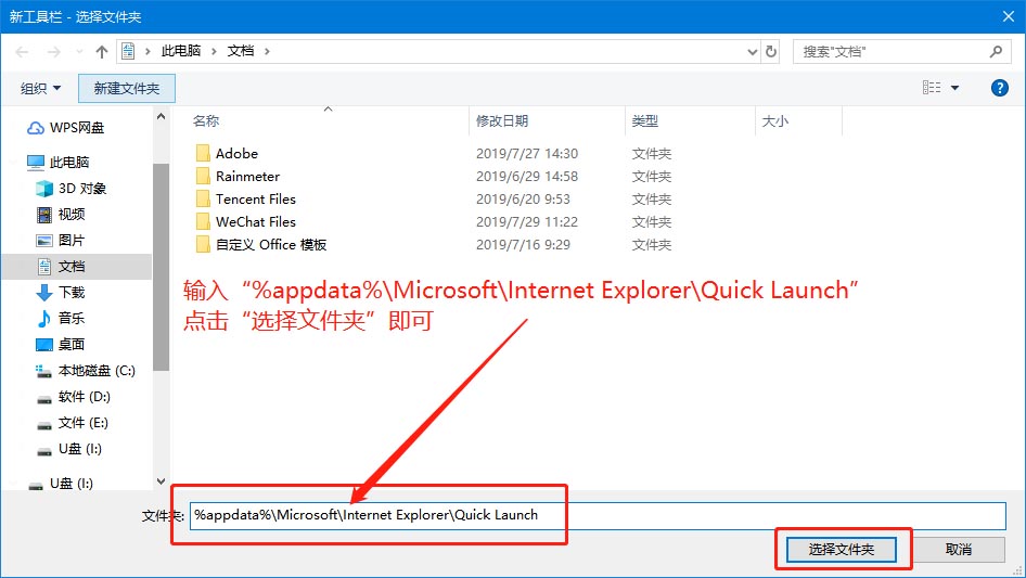 2、在新建工具栏页面中,在“文件夹”中输入“%appdata%\Microsoft\Internet Explorer\Quick Launch”并单击“选择文件夹”