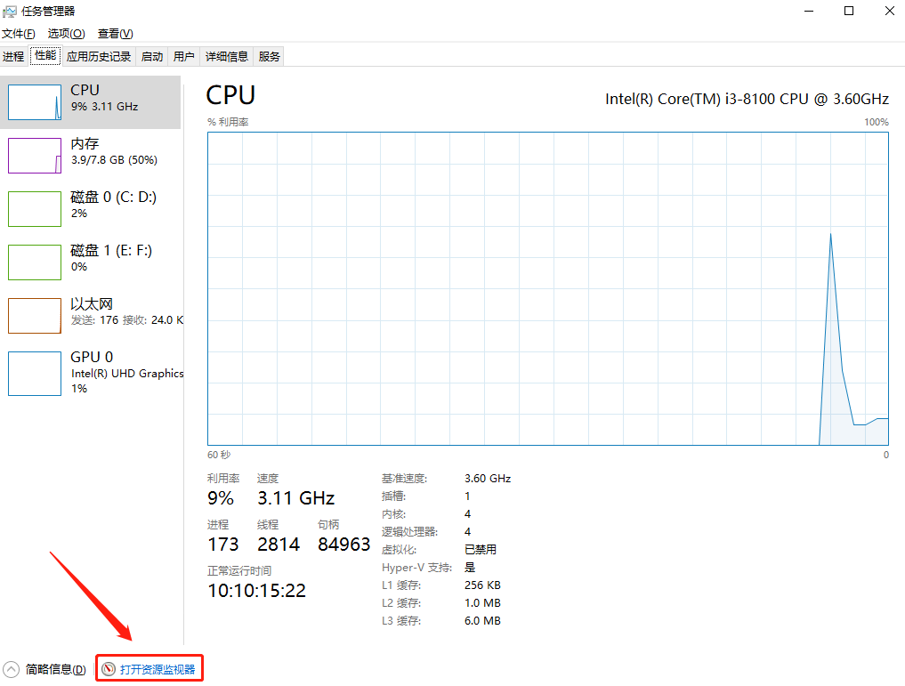 对于这种情况我们打开任务管理器,进入性能窗口,打开资源监视器。