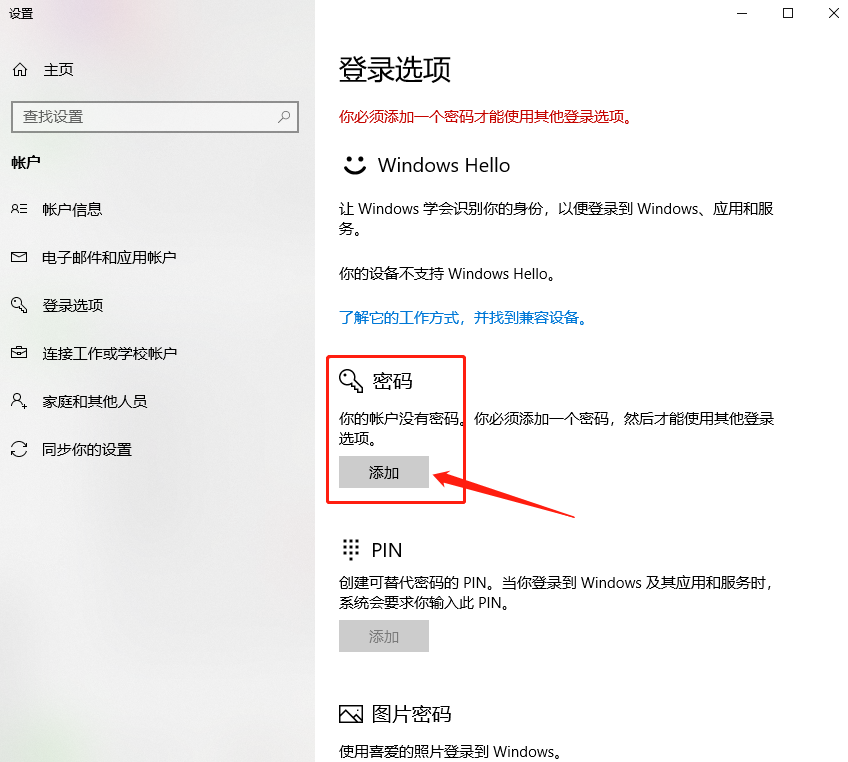 在登录选项界面中,我们添加设置一个开机账户登录密码。
