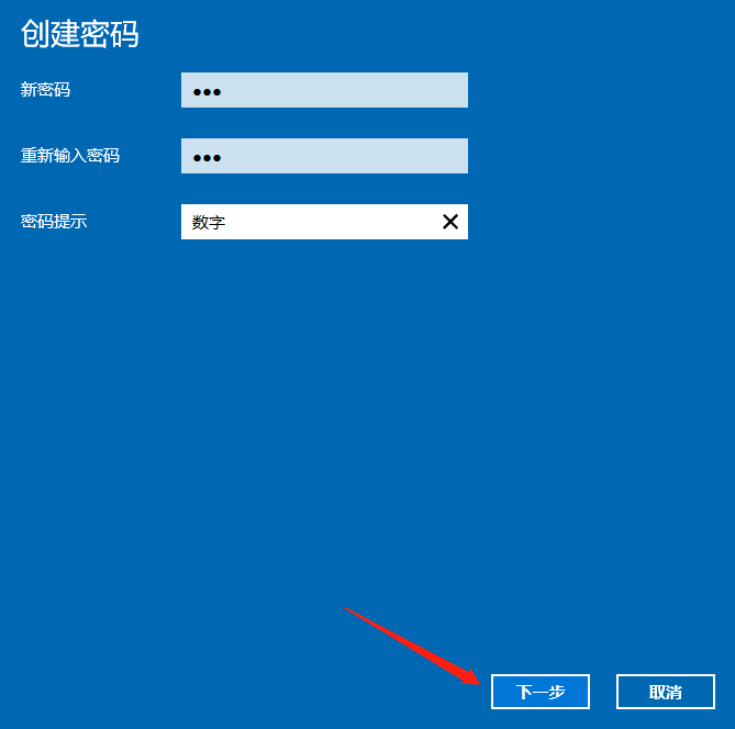 点击“添加”,出现一个创建密码的界面,我们在界面中设置密码,然后点击下一步。