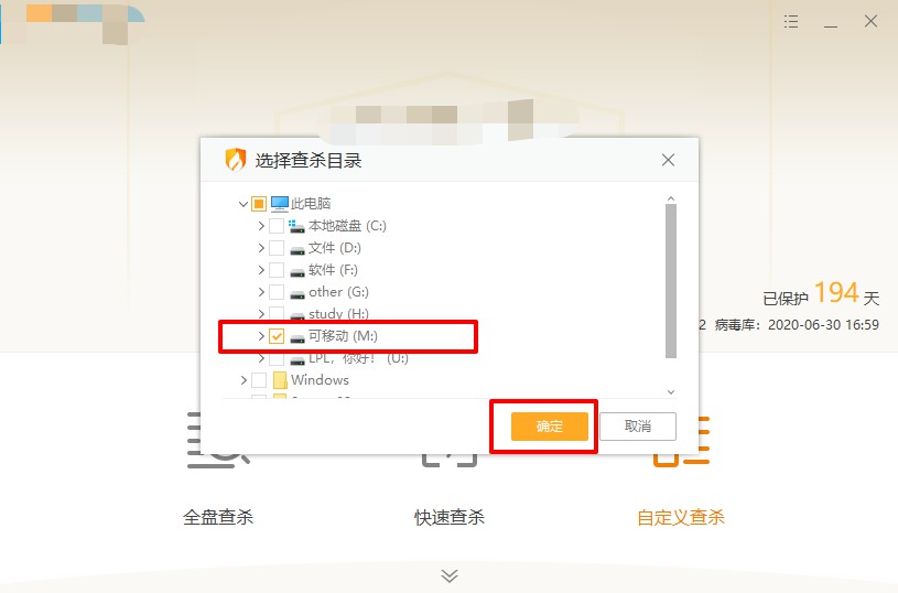 3、之后,就直接选择扫描区域为u盘,点击“确定”并根据提示操作清理病毒即可
