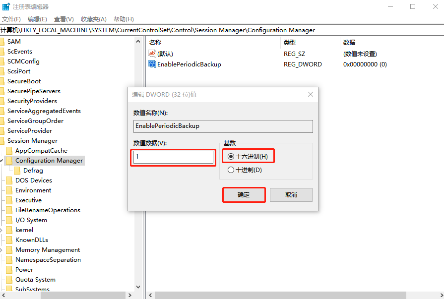 6、双击EnablePeriodicBackup,点击“十六进制”,将数值数据改为“1”并点击“确定”即可